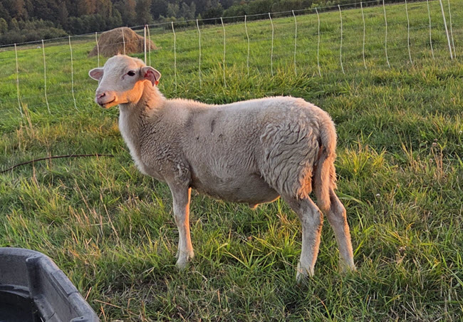 Classic framey white ram amb. Dam is from local genetics plus a distant Thistle Grove Farm (John Bare, DVM, Iowa). The sire is special: I was able to trade some proven rams for two top-performing ram lambs off the range at the USDA Sheep Research Station in Dubois, ID. Their sire is KRK. These guys’ dams came from the US Meat Animal Research Station (US MARC) research flock in Lincoln, NE. These sheep have been raised in an extensive, low-input system that’s a true test of hardiness and wiliness (they live in wolf country and are ranged on thousands of acres in large bands with guardian dogs). So I’m excited to see what these genetics do in our system in the PNW. This is a unique opportunity to capture some pretty diverse genetics and some of the magic gold dust from MARC, the home of the “Easycare” composite hair sheep.
